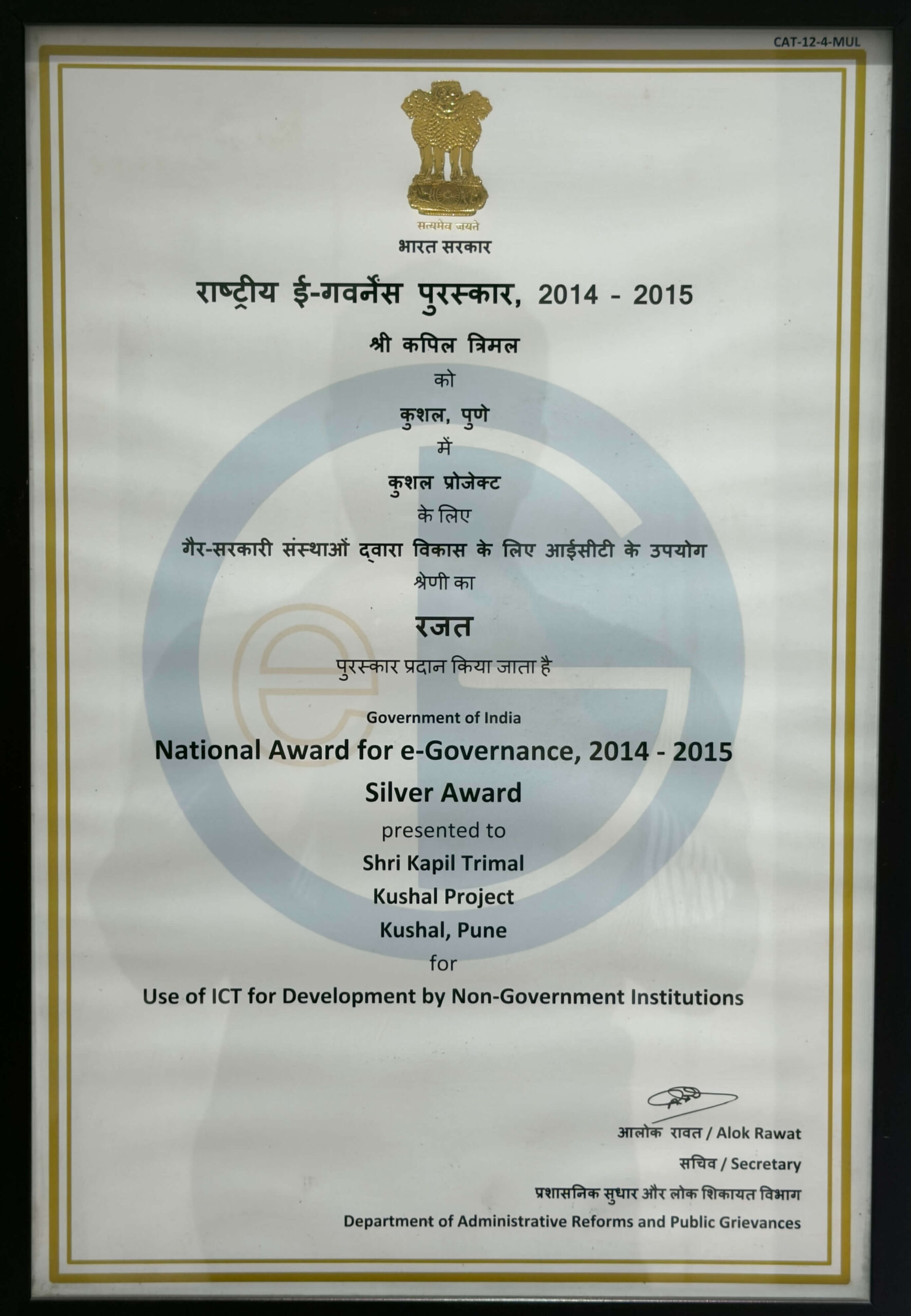 In 2015 Kapil Trimal received the National E-Governance Award by the Department of Administrative Reforms and Public Greviances, Govt of India at the hand of Skill and Labour Minister Shri. Rajiv Pratap Rudy.